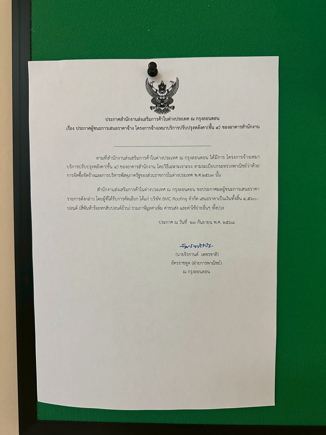 ประกาศผู้ชนะการเสนอราคาโครงการจ้างเหมาบริการปรับปรุงซ่อมแซมหลังคา (ชั้น 4) ของอาคารสำนักงาน