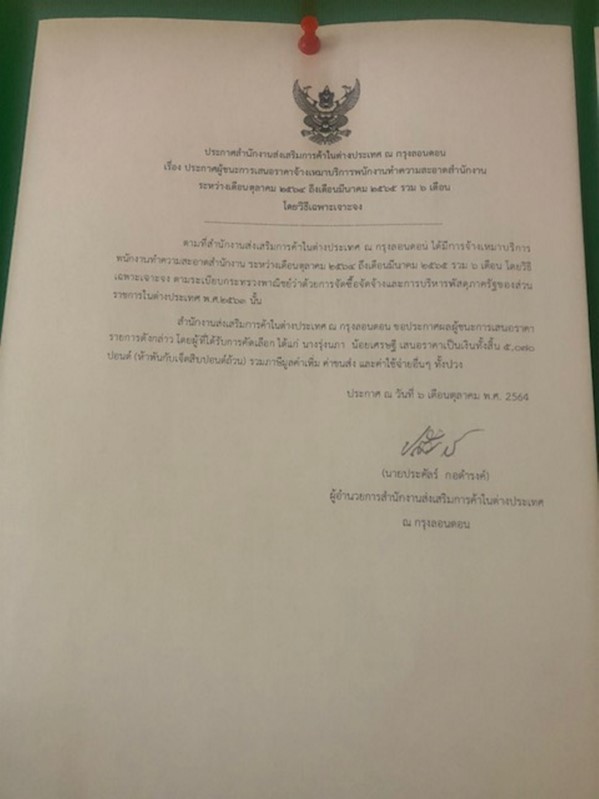 ประกาศผู้ชนะราคาโครงการจ้างเหมาทำความสะอาดสำนักงานเดื่อน ต.ค.64-มี.ค. 65