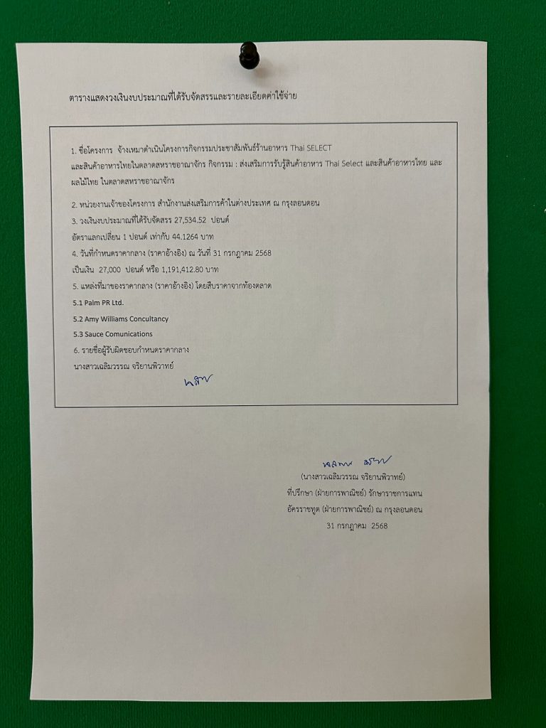 ประกาศราคากลางโครงการกิจกรรมประชาสัมพันธ์ร้านอาหาร Thai Select แลัสินค้าอาหารไทยในตลาดสหราชอาณาจักร กิจกรรม ส่งเสริมการรับรู้สินค้าอาหาร Thai Select และสินค้าอาหารไทยในตลาดสหราชอาณาจักร