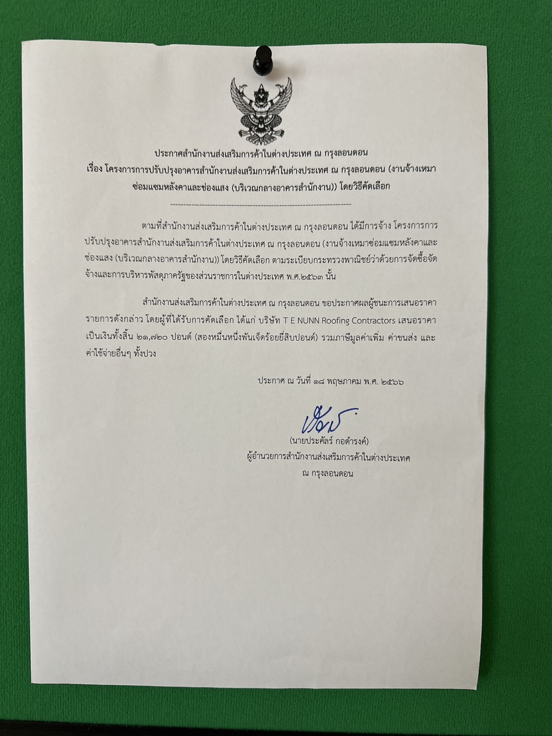 ประกาศโครงการปรับปรุงอาคารสำนักงานส่งเสริมการค้าในต่างประเทศ ณ กรุงลอนดอน (งานจ้างเหมาซ่อมแซมหลังคาและช่องแสง (บริเวณกลางอาคารสำนักงาน)) โดยวิธีคัดเลือก