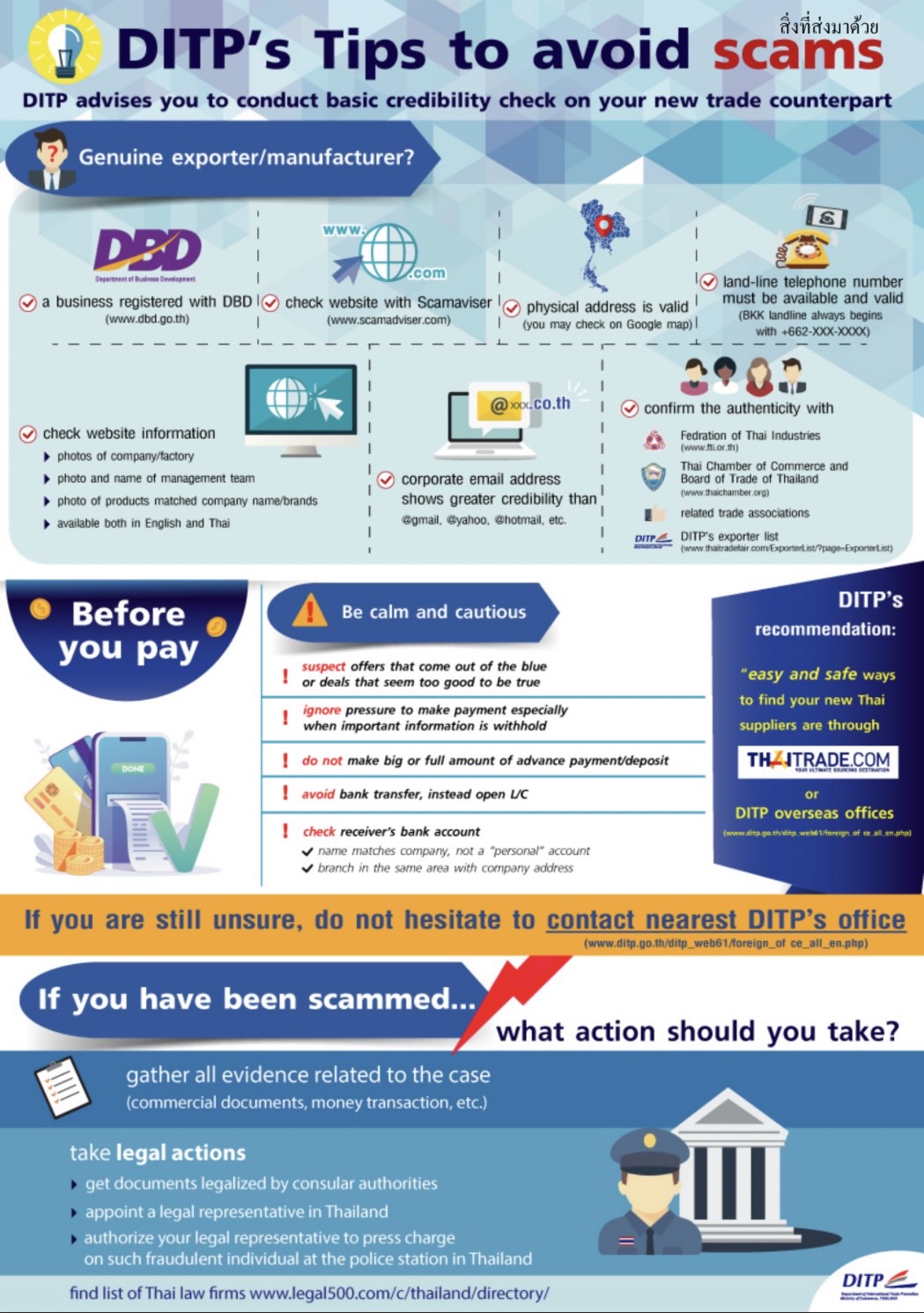 Home In Focus DITP’s ... DITP’s Tips to avoid scams Facebook Twitter Pinterest WhatsApp DITP tips to avoid scams 67 RELATED ARTICLESMORE FROM AUTHOR The Provincial E-Catalog ... ประกาศรับสมัครบุคคลเพื่อค... THAI HOM MALI RICE CERTIF... Thai Silver Exporters Mem... Colleen Products