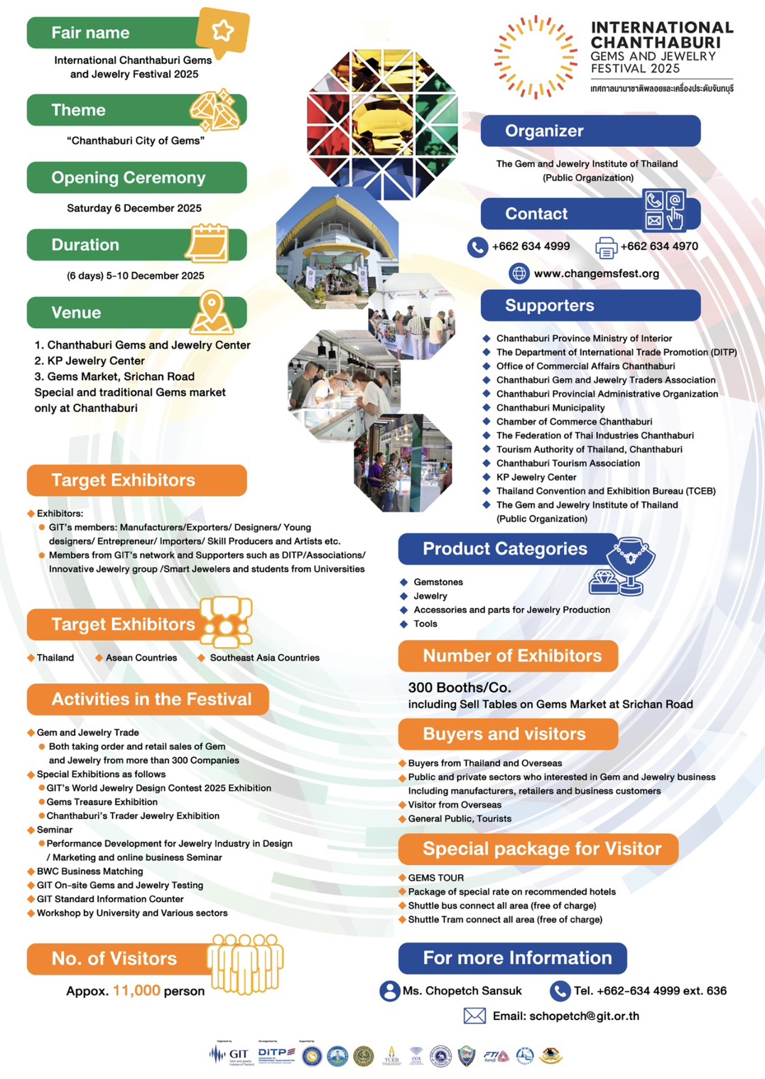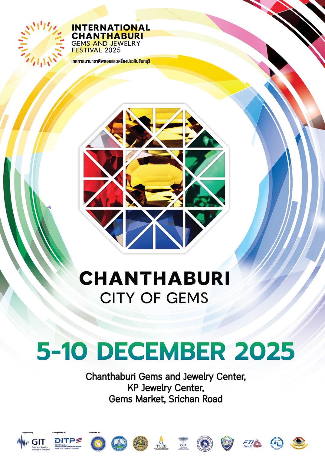 The “International Chanthaburi Gems & Jewelry Festival 2025” for the sixth consecutive year under the theme “Chanthaburi – City of Gems” from 5–10 December 2025 at the Chanthaburi Gems and Jewelry Center, the KP Jewelry Center and the Gem Market on Sri Chan Road, Chanthaburi.