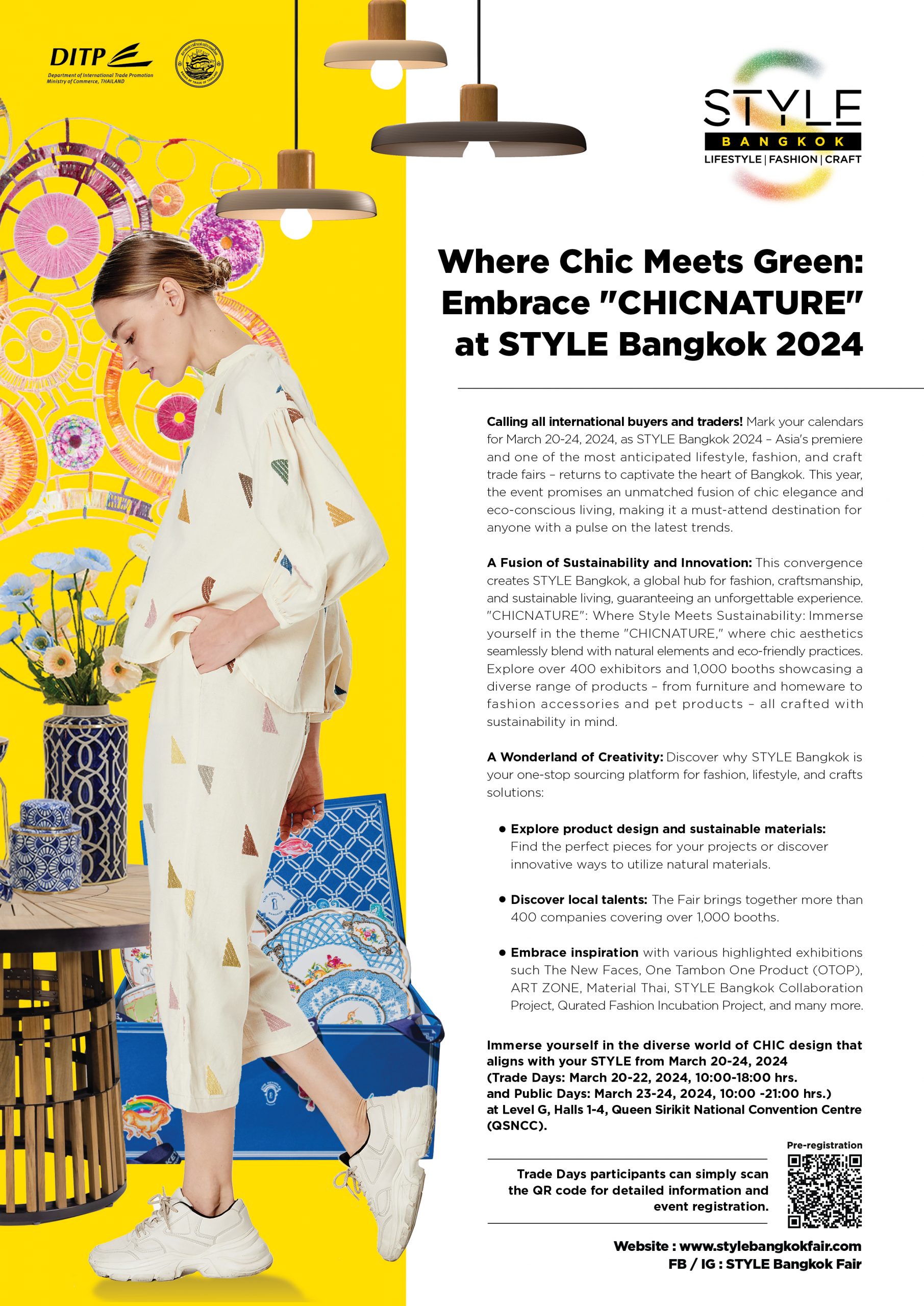 Home Events in Thailand STYLE Bangkok... STYLE Bangkok 2024 Facebook Twitter Pinterest WhatsApp RELATED ARTICLESMORE FROM AUTHOR Amazing Thailand Grand De... Thailand Local SDGs Plus ... Thailand F&B Online ... ISAN Market – Onlin... TILOG-Logistitix, 21 Augu...
