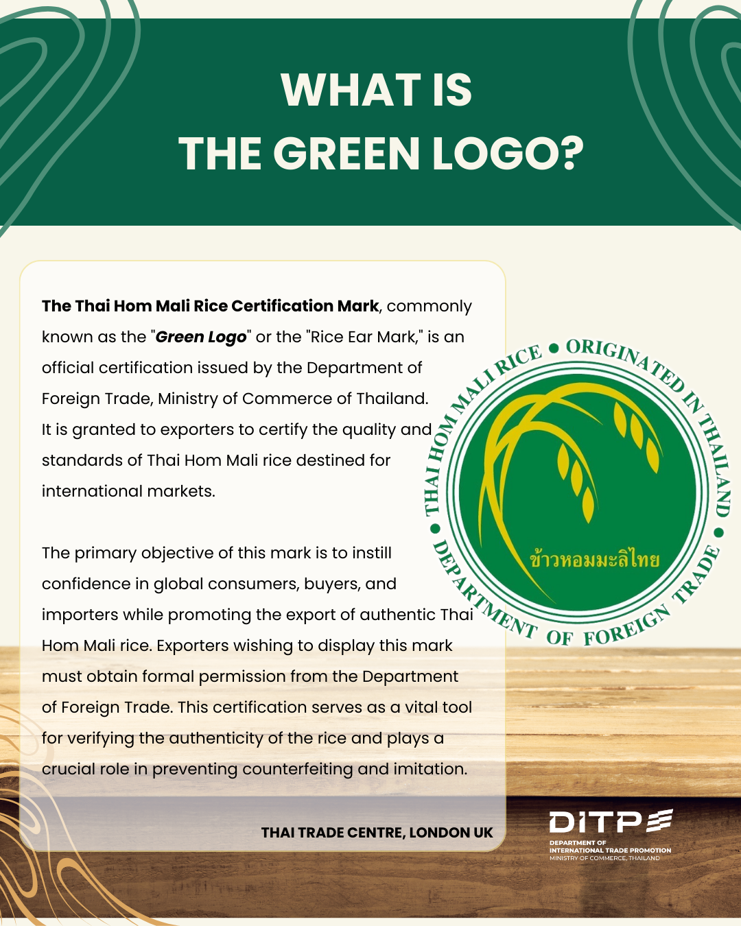 “Choosing the Green Logo is more than just selecting the finest flavor—it is a commitment to supporting fair trade and ensuring you receive 100% genuine Thai Hom Mali Rice from its true origin.”